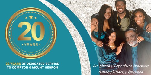 We celebrate the remarkable journey of Pastor Dr. Frank Jamerson and 1st Lady Mecca Jamerson, who have faithfully served Compton and Mt. Hebron for two decades. Their unwavering commitment, compassion, and leadership have touched generations, bringing hope, healing, and a sense of community to our hearts. With a profound dedication to spreading God's love and nurturing spiritual growth, Pastor Dr. Frank Jamerson and 1st Lady Mecca Jamerson have been pillars of strength in our congregation, offering guidance, support, and inspiration to all who have crossed their path.